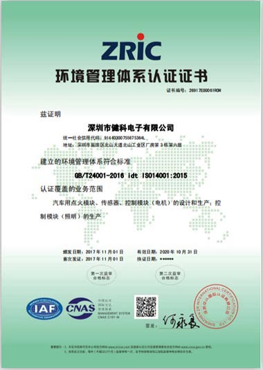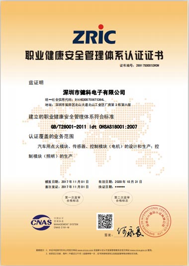 健科電子ISO14001/OHSAS18001體系順利通過認證,于2017年11月1日正式頒發了證書。